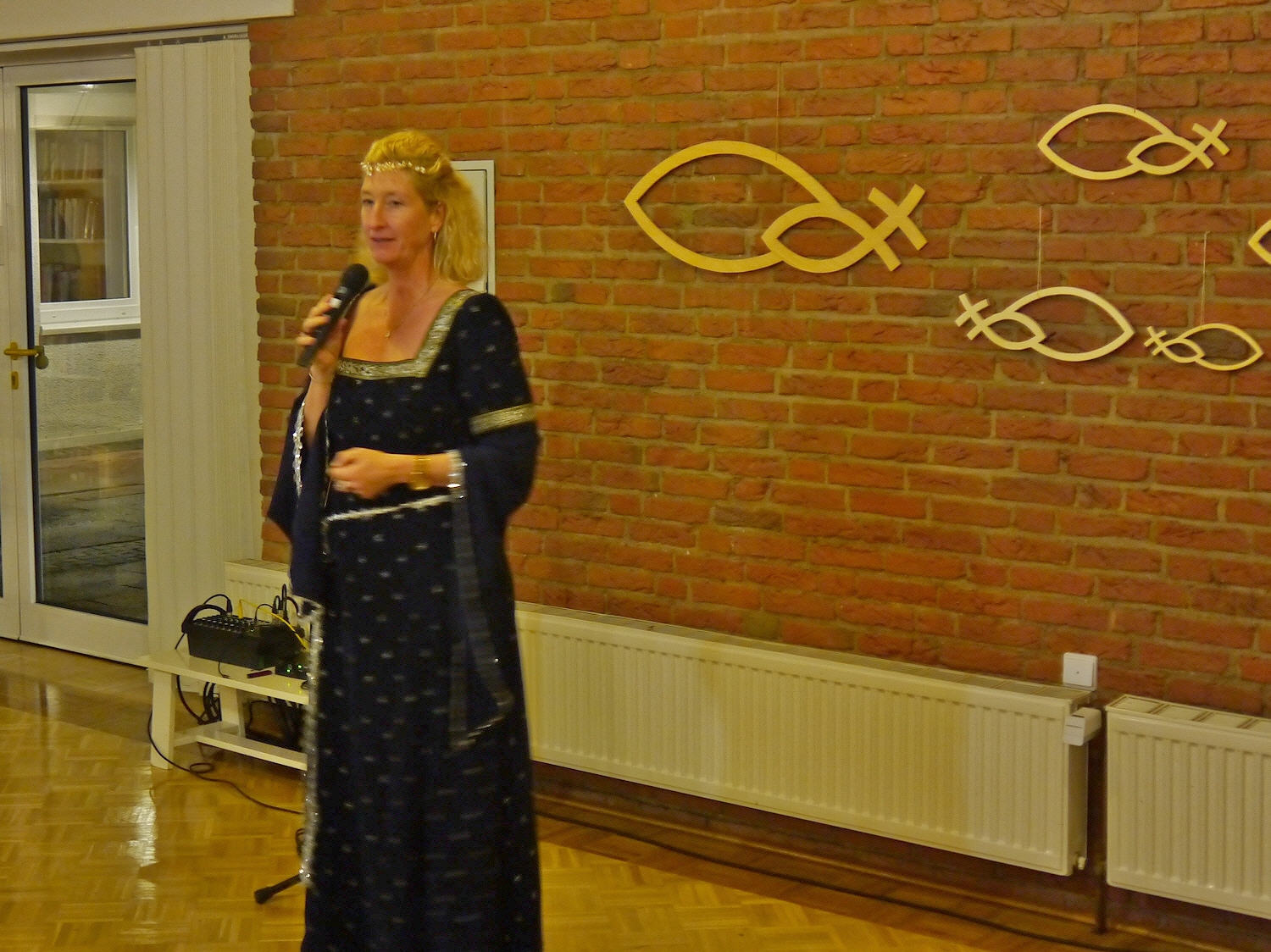 Eingeleitet wurde der Abend von Märchenerzählerin Sonja Fischer. Die Künstlerin vom Erzähltheater Osnabrück verzauberte die Gäste im bis auf den letzten Platz gefüllten Gemeindesaal mit drei Märchen für Erwachsene, die zum Lachen, aber auch zum Nachdenken einluden. Auf ihrer Website zitiert Sonja Fischer Pablo Picasso: „Der Sinn des Lebens besteht darin, deine Gabe zu finden. Der Zweck des Lebens ist, sie zu verschenken.“ Ihrer mitreißenden Erzählweise merkte man an, dass Sonja Fischer ihre Gabe gefunden hat. „Ich liebe meinen Beruf nicht nur – ich lebe ihn“, sagt sie über sich selbst.
