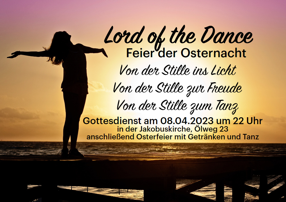 Von der Stille ins Licht Von der Stille zur Freude Von der Stille zum Tanz Gottesdienst am Samstag, 8. April, um 22 Uhr, anschließend Osterfeier mit Getränken und Tanz