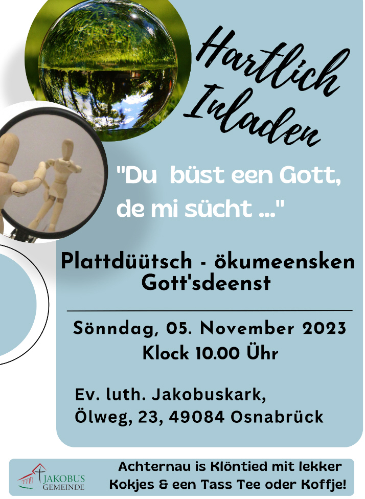 Hartlich Inladen to uns plattdüütsch-ökumeensken Gottesdeenst in de Jakobuskark.