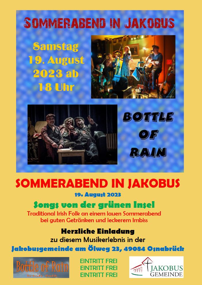 Am Samstag, 19. August, lädt die Jakobusgemeinde ab 18 Uhr zum „Sommerabend in Jakobus“ mit der Irish-Folk-Band Bottle of Rain ein. Geboten wird Traditional Irish Folk an einem lauen Sommerabend bei guten Getränken und leckerem Imbiss.