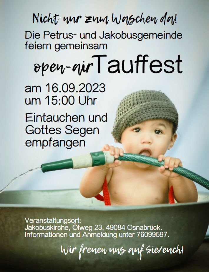 Das Tauffest beginnt um 15 Uhr mit dem Taufgottesdienst mit viel Musik. Hinterher können die Familien gemeinsam die Räumlichkeiten der Jakobusgemeinde draußen und drinnen nutzen und bei Kuchen und Getränken die Taufen feiern.