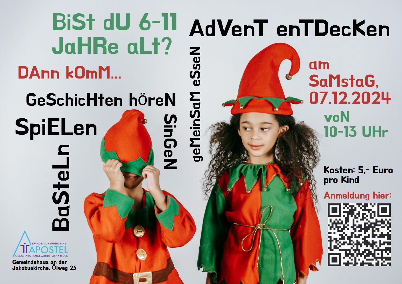 In der Adventszeit lädt die Apostel-Gesamtkirchengemeinde am Samstag, 7. Dezember, von 10 bis 13 Uhr, Kinder im Alter von 6 bis 11 Jahren – wir freuen uns auf Kinder aller Konfessionen – in das Gemeindehaus der Jakobusgemeinde am Ölweg 23 ein.