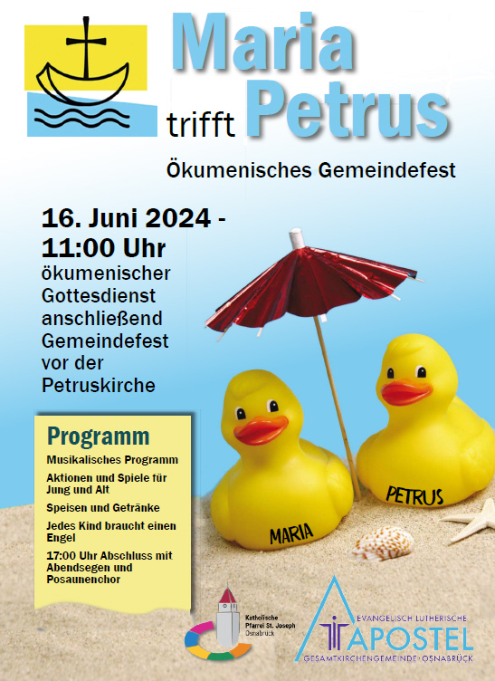 Unter der Überschrift „Maria trifft Petrus“ laden die Evangelisch-lutherische Apostel-Gesamtkirchengemeinde und die katholische Pfarrei St. Joseph am Sonntag, 16. Juni, zum ökumenischen Gemeindefest vor der Petruskirche an der Albert-Schweitzer-Str. 33 ein. Das Gemeindefest beginnt mit einem Gottesdienst um 11 Uhr.