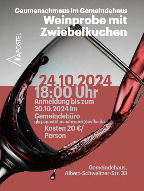 Die Apostel-Gesamtkirchengemeinde lädt am Donnerstag, 24. Oktober, um 18 Uhr zu einer Weinprobe mit Zwiebelkuchen in das Gemeindehaus, Albert-Schweitzer-Str. 33, 49086 Osnabrück, ein.