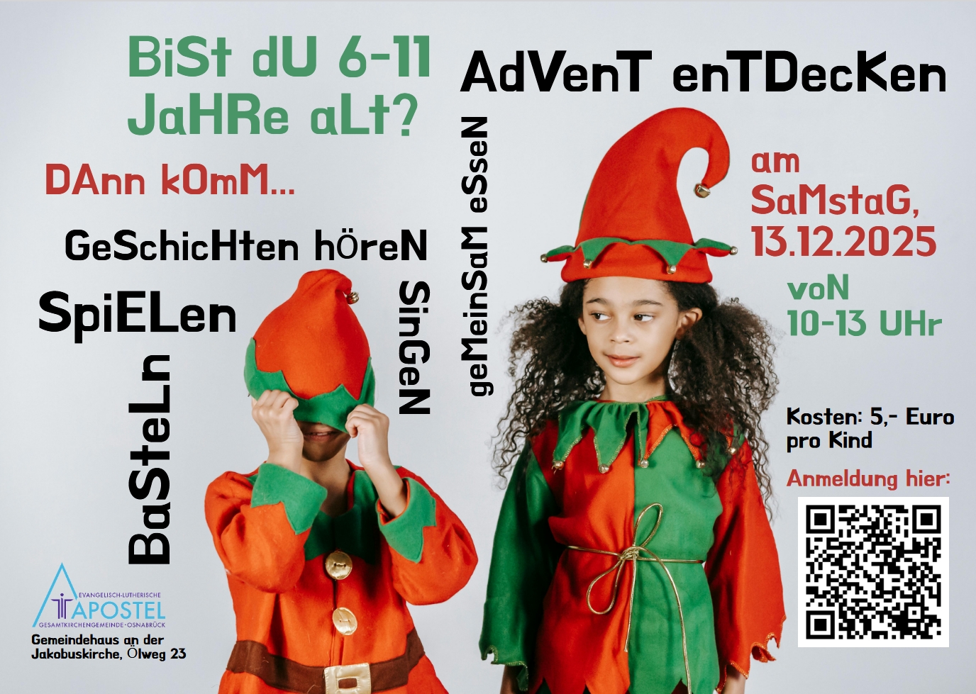 In der Adventszeit lädt die Apostel-Gesamtkirchengemeinde am Samstag, 13. Dezember, von 10 bis 13 Uhr, Kinder im Alter von 6 bis 11 Jahren – wir freuen uns auf Kinder aller Konfessionen – in das Gemeindehaus der Jakobusgemeinde am Ölweg 23 ein.