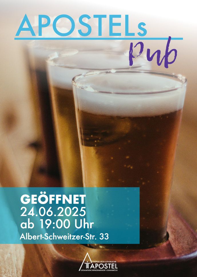 Am Dienstag, 24. Juni, ab 19 Uhr, hat wieder der „Apostel-Pub“ im Gemeindehaus an der Petruskirche, Albert-Schweitzer-Str. 33, 49086 Osnabrück, geöffnet. Kommen Sie vorbei und genießen Sie ein kühles Getränk an der Theke in guter Gemeinschaft.