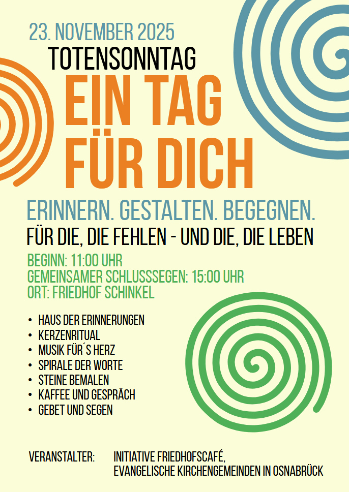 Am Ewigkeitssonntag, 23. November, laden die evangelischen Kirchengemeinden in Osnabrück-Schinkel gemeinsam mit der Initiative Friedhofscafé zwischen 11 und 15 Uhr zu einem besonderen Aktionstag auf dem Friedhof Schinkel ein.