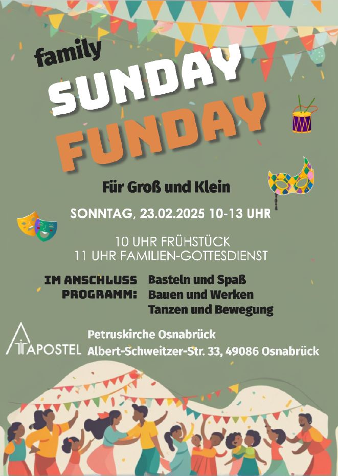 Am Sonntag, 23. Februar, lädt die Apostel-Gesamtkirchengemeinde in der Zeit von 10 bis 13 Uhr zum „Family Sunday Funday“ in die Petruskirche, Albert-Schweitzer-Str. 33, 49086 Osnabrück, ein.