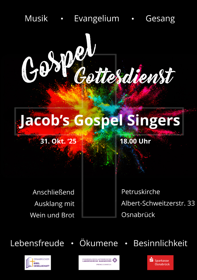 Zu einem ökumenischen Gospelgottesdienst laden die Evangelisch-lutherische Apostel-Gesamtkirchengemeinde und die Katholische Kirchengemeinde Heilig Kreuz am Freitag, 31. Oktober, um 18 Uhr in die Petruskirche, Albert-Schweitzer-Straße 33, 49086 Osnabrück, ein. Zum Reformationstag freuen sich die Gemeinden und die „Jacobs‘ Gospel Singers“, der älteste Gospelchor Osnabrücks, auf einen Gottesdienst voller Musik, Gesang, Lebensfreude und Besinnlichkeit, der zum Verweilen und Mitfeiern einlädt.