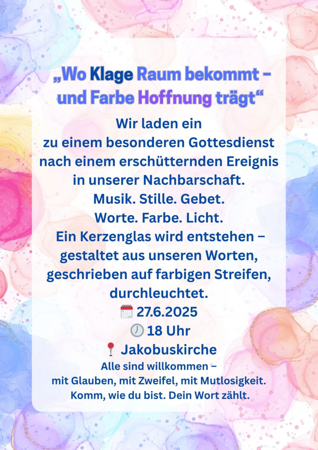 Unter der Überschrift „Wo Klage Raum bekommt – und Farbe Hoffnung trägt“ lädt die Evangelisch-lutherische Apostel-Gesamtkirchengemeinde zu einem besonderen Gottesdienst nach einem erschütternden Ereignis in unserer Nachbarschaft ein. Der Gottesdienst findet in der Jakobuskirche, Ölweg 23, 49084 Osnabrück, statt und beginnt um 18 Uhr.
