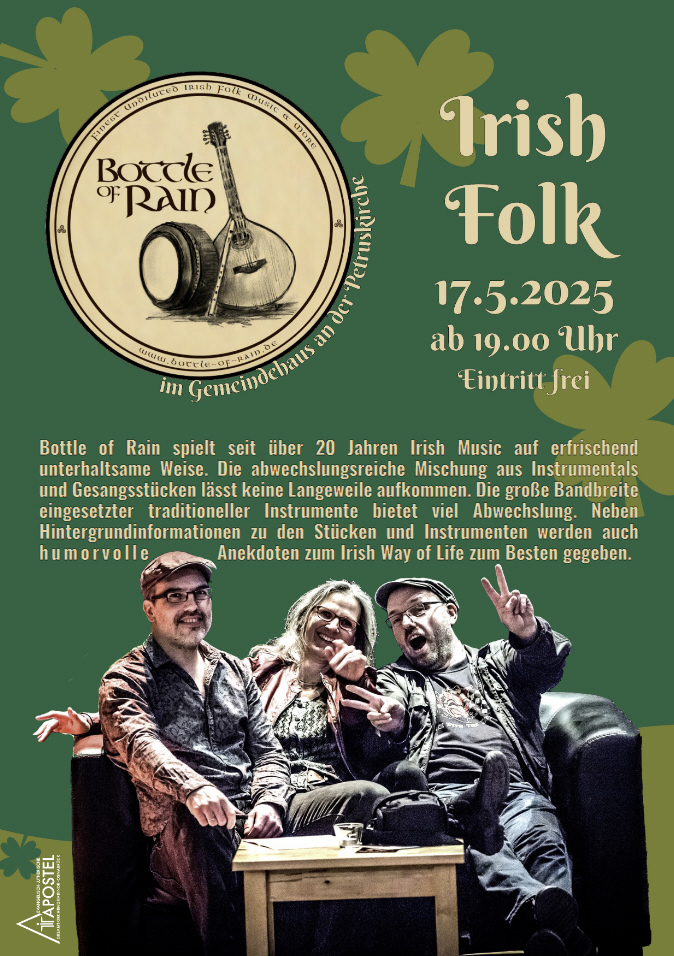 Die Evangelisch-lutherische Apostel-Gesamtkirchengemeinde lädt am Samstag, 17. Mai, um 19 Uhr zu einem Irish-Folk-Konzert mit der Band „Bottle of Rain“ in das Gemeindehaus an der Petruskirche, Albert-Schweitzer-Str. 33, 49086 Osnabrück, ein.