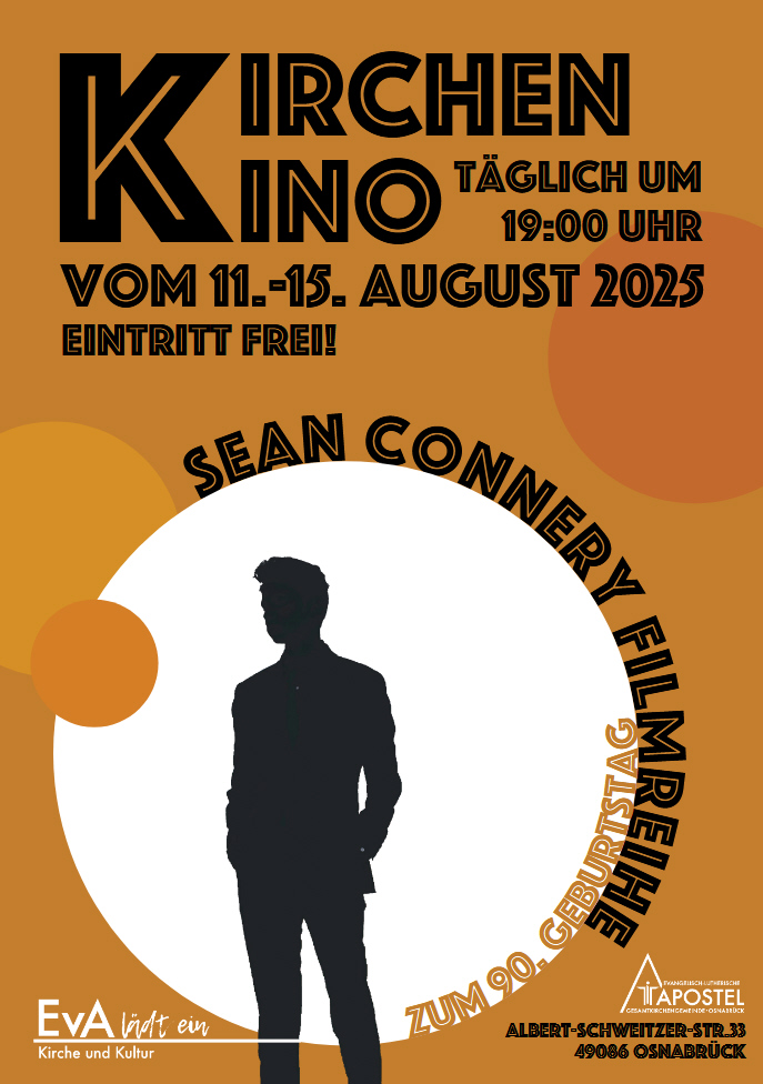 Im August setzt die Evangelisch-lutherische Apostel-Gesamtkirchengemeinde das Kirchen-Kino mit einer Filmreihe zum 90. Geburtstag von Sean Connery fort. Vom 11. bis 15. August werden täglich um 19 Uhr ausgewählte Filme mit dem beliebten Schauspieler in seiner legendären Rolle, die ihn weltberühmt gemacht hat, in der Petruskirche, Albert-Schweitzer-Str. 33, 49086 Osnabrück, gezeigt.