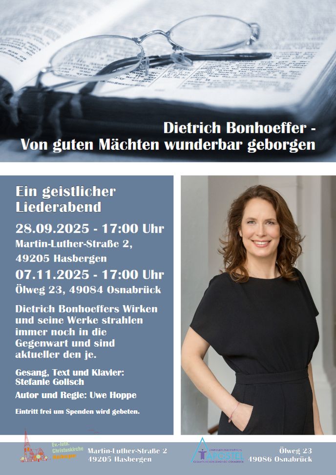 Unter der Überschrift „Dietrich Bonhoeffer – Von guten Mächten wunderbar geborgen“ lädt die Evangelisch-lutherische Apostel-Gesamtkirchengemeinde am Freitag, 7. November, um 17 Uhr zu einem geistlichen Liederabend in die Jakobuskirche, Ölweg 23, 49084 Osnabrück, ein.