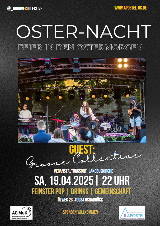 Feiern Sie mit Groove Collective in den Ostermorgen hinein. Groove Collective ist eine aufstrebene Popband, bestehend aus vier Profi-Musiker*innen aus Osnabrück und Melle. Ihre musikalischen Kreationen vereinen bekannte Popsongs mit funkigen Vibes und versprechen ein unvergessliches Hörerlebnis.