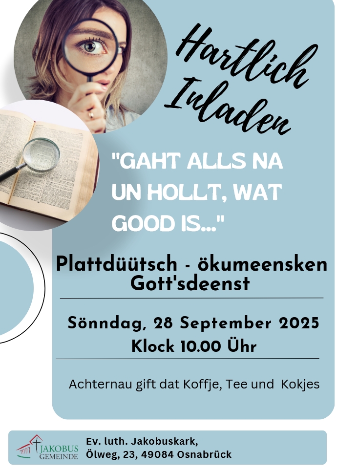 Unter der Überschrift „Prüft alles und behaltet das Gute“ – der Jahreslosung für das Jahr 2025 – lädt die Evangelisch-lutherische Apostel-Gesamtkirchengemeinde am Sonntag, 28. September, um 10 Uhr zum plattdeutschen ökumenischen Gottesdienst in die Jakobuskirche, Ölweg 23, 49084 Osnabrück, ein.