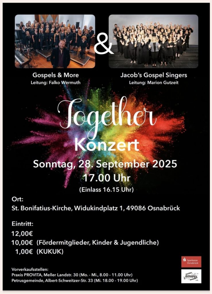 Am Sonntag, 28. September, laden die Gospelchöre Gospels & More aus Bremen unter Leitung von Falko Wermuth und Jacob's Gospel Singers aus Osnabrück unter Leitung von Marion Gutzeit zum „Together-Konzert“ in die St.-Bonifatius-Kirche, Widukindplatz 1, 49086 Osnabrück, ein. Das Konzert beginnt um 17 Uhr, Einlass ist ab 16.15 Uhr.