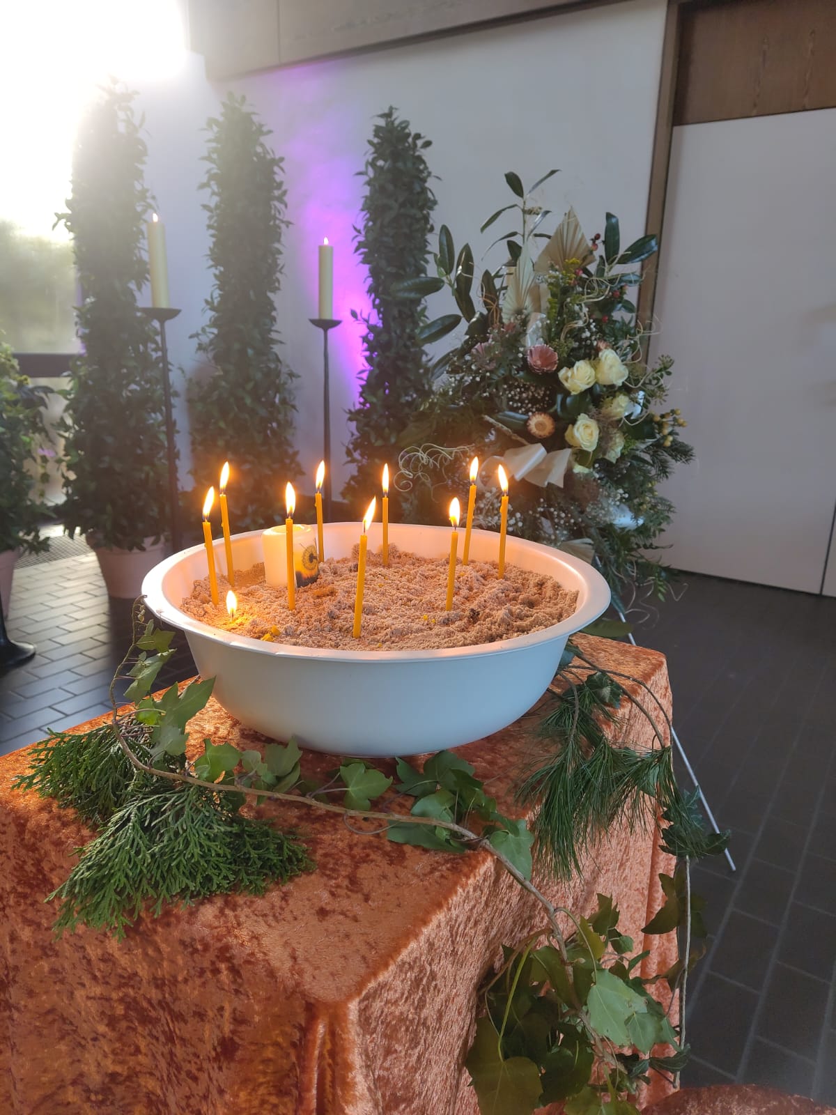 In der Kapelle gab es diverse Aktionen zum Mitmachen, wie beispielsweise ein Haus der Erinnerungen, einen Bücherstand, Klangschalen zum Hören und Ausprobieren, die „Spirale der Hoffnungsworte“, eine Playlist mit Liedern für Trauerfeiern, Steine zum Bemalen und Kerzen zum Anzünden. Dazu heißen Kaffee und Tee an schön gedeckten Tischen.