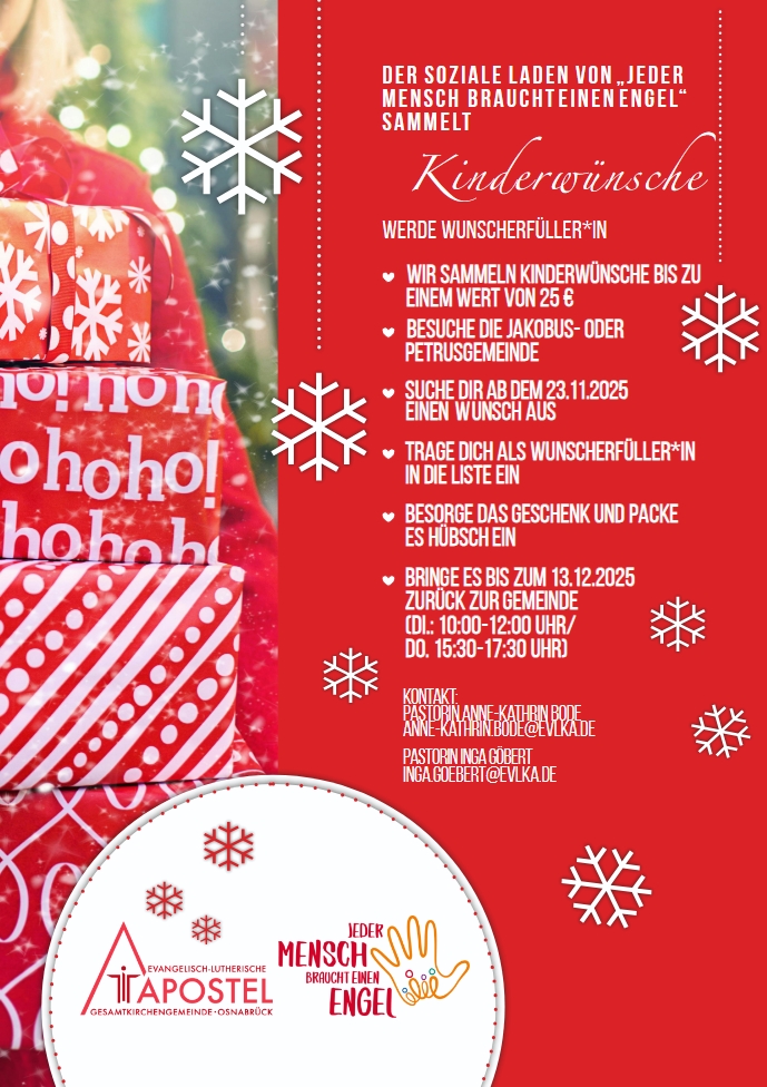 Besuche die Jakobus- oder Petrusgemeinde, suche dir ab dem 23. November einen Wunsch aus und trage dich als Wunscherfüller*in in die Liste ein. Besorge das Geschenk, packe es hübsch ein und bringe es bis zum 13. Dezember zurück zur Gemeinde (Dienstag 10–12 Uhr, Donnerstag 15:30–17:30 Uhr).