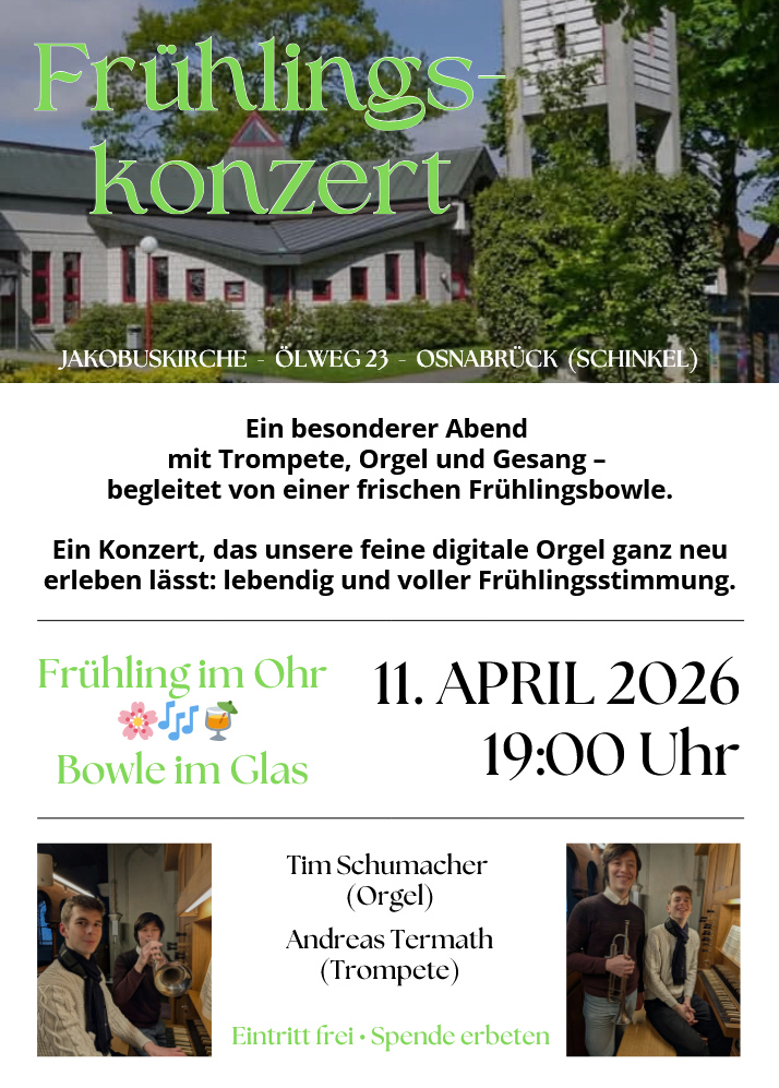 Die Evangelisch-lutherische Apostel-Gesamtkirchengemeinde lädt am Samstag, 11. April, um 19 Uhr zum Frühlingskonzert in die Jakobuskirche, Ölweg 23, 49084 Osnabrück ein. Unter dem Motto „Frühling im Ohr – Bowle im Glas“ erwartet Sie ein besonderer Abend mit Tim Schumacher an der Orgel, Andreas Termath an der Trompete und Gesang – begleitet von einer frischen Frühlingsbowle. Freuen Sie sich auf ein Konzert, das die feine digitale Orgel in der Jakobuskirche ganz neu erleben lässt: lebendig und voller Frühlingsstimmung.